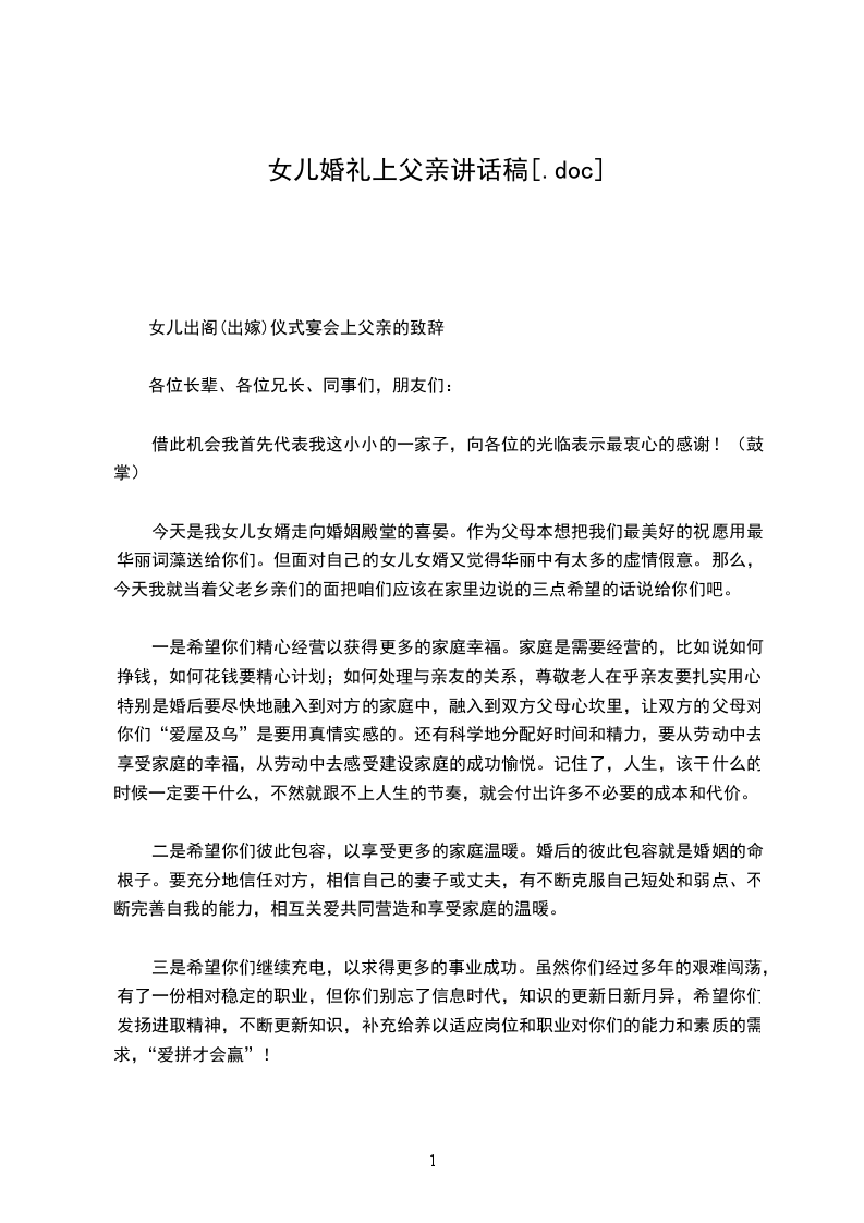 今天是我女儿女婿走向婚姻殿堂的喜晏。作为父母本想把我们最美好的祝愿用最华丽词藻送给你们。但面对自己的女儿女婿又觉得华丽中有太多的虚情假意。那么,今天我就当着父老乡亲们的面把咱们应该在家里边说的三点希望的话说给你们吧。