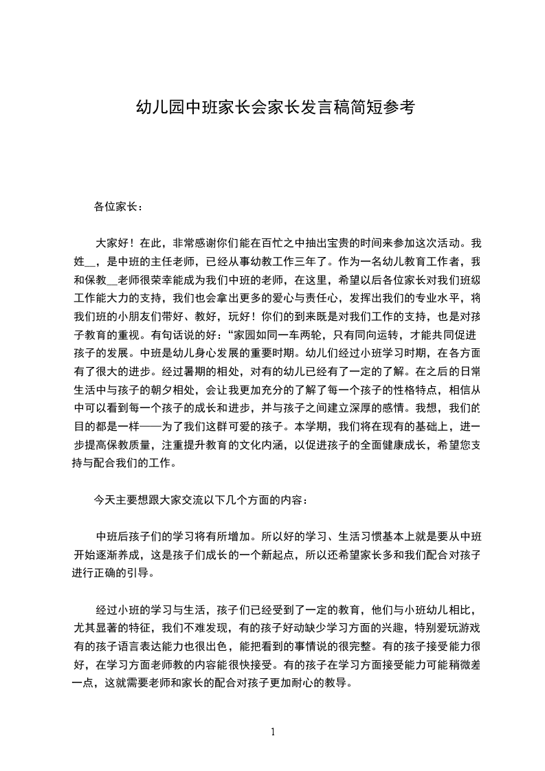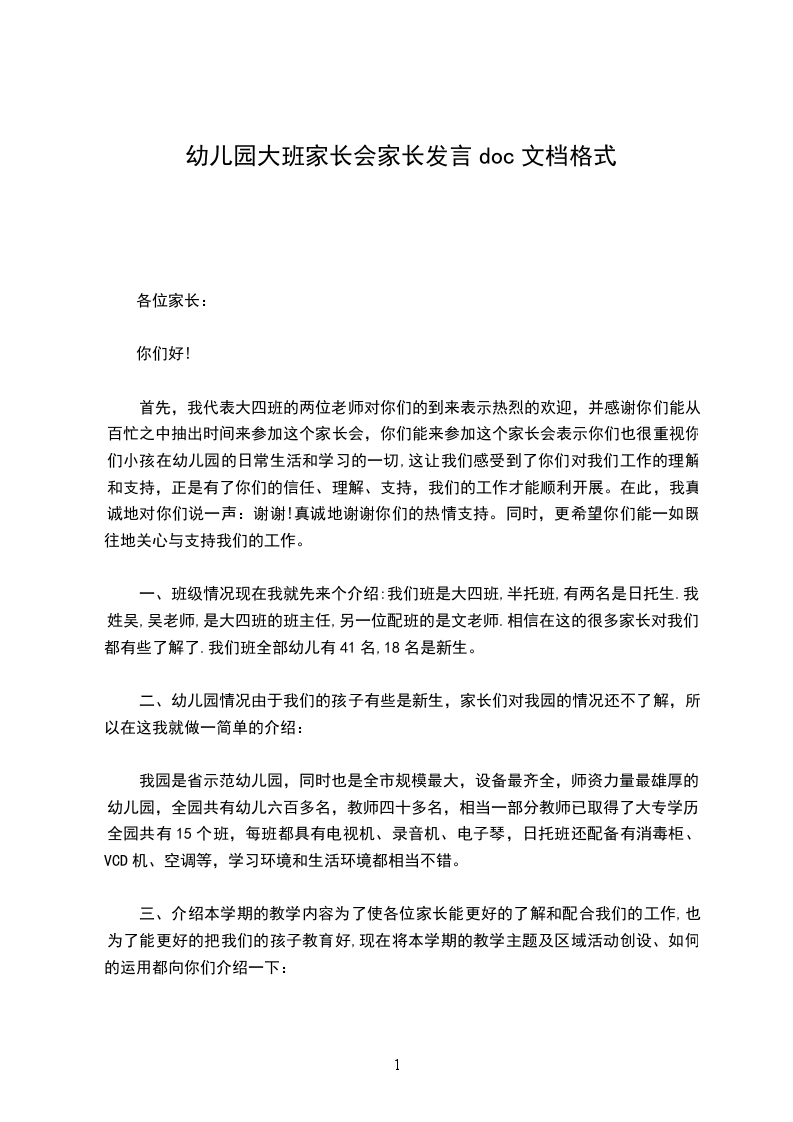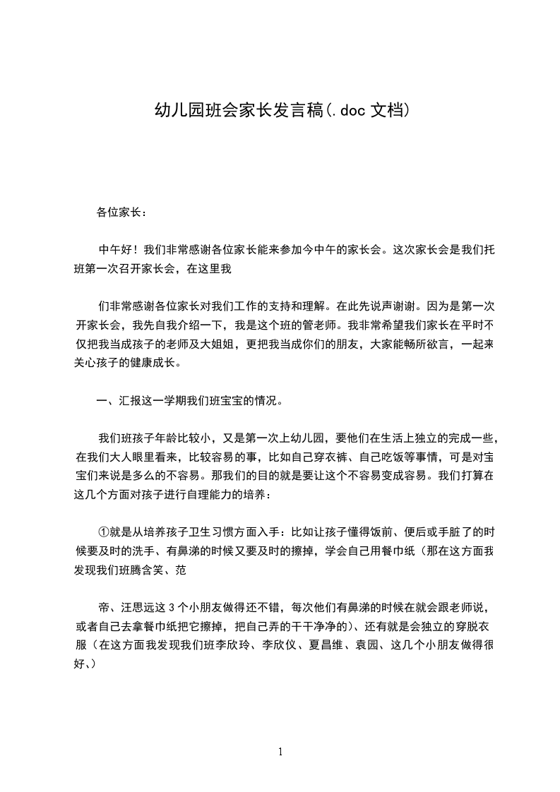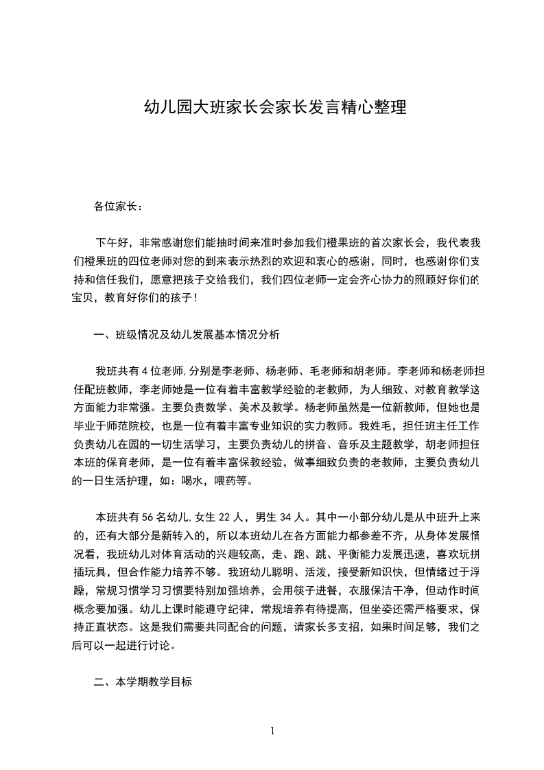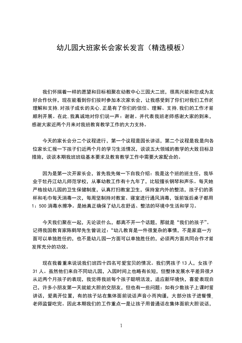 因为是第一次开家长会,首先我先做一下自我介绍:我是这个班的班主任,我毕业于牡丹江幼儿师范学校,从事幼教工作有十九年了,比较擅长钢琴和声乐。每天她严格按幼儿园的卫生保健制度,认真打扫教室卫生,保持室内外的整洁,孩子们的茶杯和毛巾每天消毒一次,每周坚制持对教室、寝室进行通风消毒,饭前饭后桌子都用1:500消毒水擦净。是她真正确保了幼儿在舒适、整洁的环境中生活和学习。