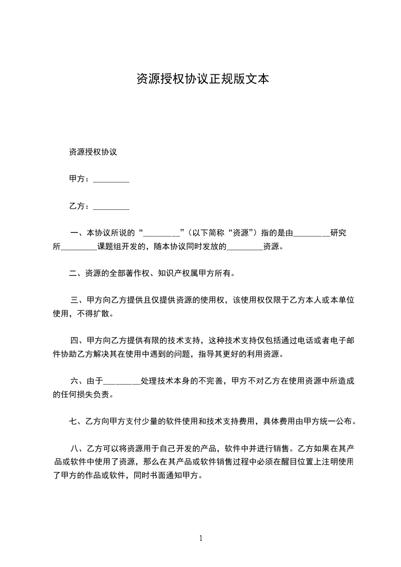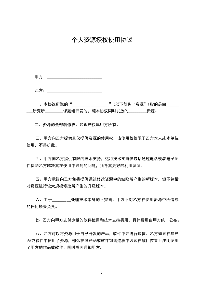 一、本协议所说的“__________________”(以下简称“资源”)指的是由_________研究所_________课题组开发的,随本协议同时发放的_________资源。