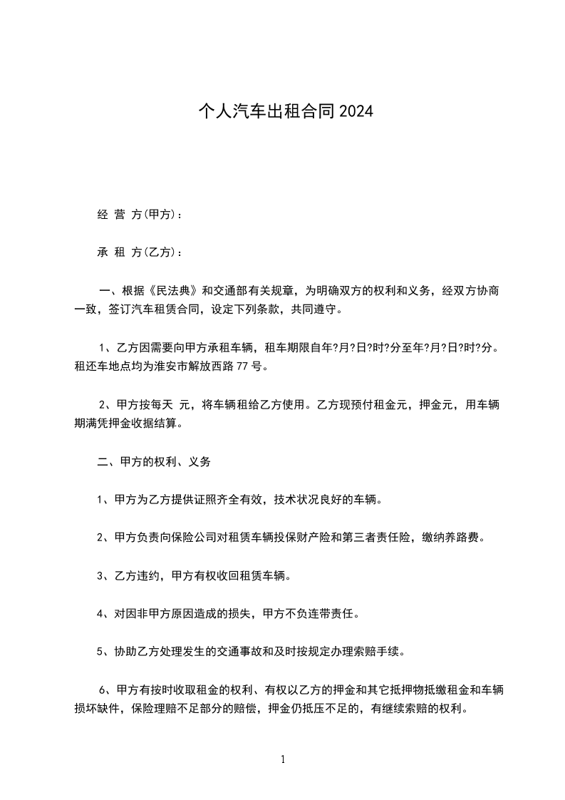 1、乙方因需要向甲方承租车辆,租车期限自年?月?日?时?分至年?月?日?时?分。租还车地点均为淮安市解放西路77号。