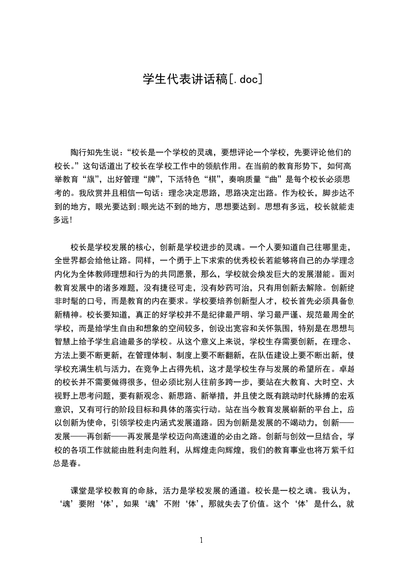 校长是学校发展的核心,创新是学校进步的灵魂。一个人要知道自己往哪里走,全世界都会给他让路。同样,一个勇于上下求索的优秀校长若能够将自己的办学理念内化为全体教师理想和行为的共同愿景,那么,学校就会焕发巨大的发展潜能。面对教育发展中的诸多难题,没有捷径可走,没有妙药可治,只有用创新去解除。创新绝非时髦的口号,而是教育的内在要求。学校要培养创新型人才,校长首先必须具备创新精神。校长要知道,真正的好学校并不是纪律最严明、学习最严谨、规范最周全的学校,而是给学生自由和想象的空间较多,创设出宽容和关怀氛围,特别是在思想与智慧上给予学生启迪最多的学校。从这个意义上来说,学校生存需要创新,在理念、方法上要不断更新,在管理体制、制度上要不断翻新,在队伍建设上要不断出新,使学校充满生机与活力,在竞争上占得先机,这才是学校生存与发展的希望所在。卓越的校长并不需要做得很多,但必须比别人往前多跨一步,要站在大教育、大时空、大视野上思考问题,要有新观念、新思路、新举措,并且使之既有跳动时代脉搏的宏观意识,又有可行的阶段目标和具体的落实行动。站在当今教育发展崭新的平台上,应以创新为使命,引领学校走内涵式发展道路。因为创新是发展的不竭动力,创新——发展——再创新——再发展是学校迈向高速道的必由之路。创新与创效一旦结合,学校的各项工作就能由胜利走向胜利,从辉煌走向辉煌,我们的教育事业也将万紫千红总是春。