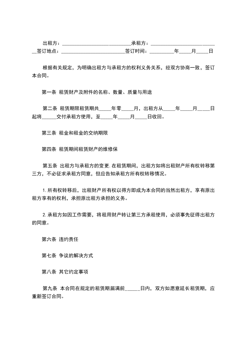 1.在__(租赁财产)出租期间,出租方如将__(租赁财产)所有权转移给第三方,应告知承租方__(租赁财产)所有权转移的情况。__(租赁财产)所有权转移后,__(租赁财产)所有权取得方即成为本合同的当然出租方,享有原出租方享有的权利,承担原出租方承担的义务。