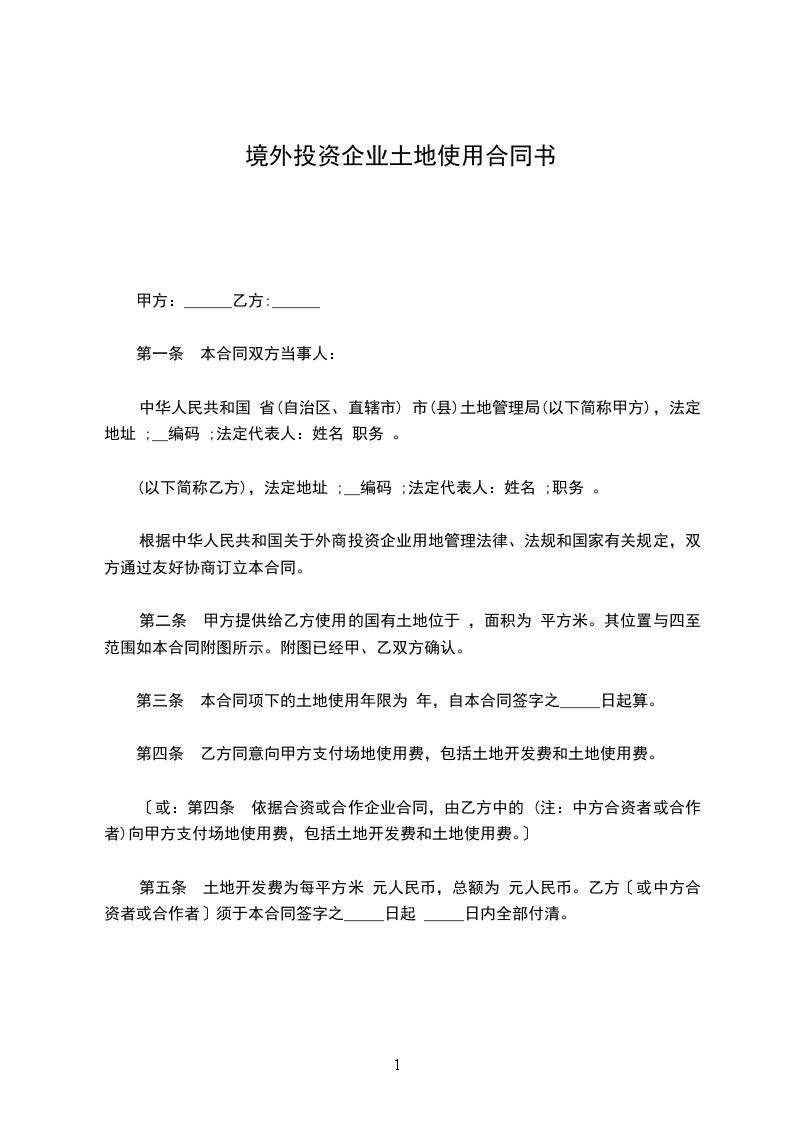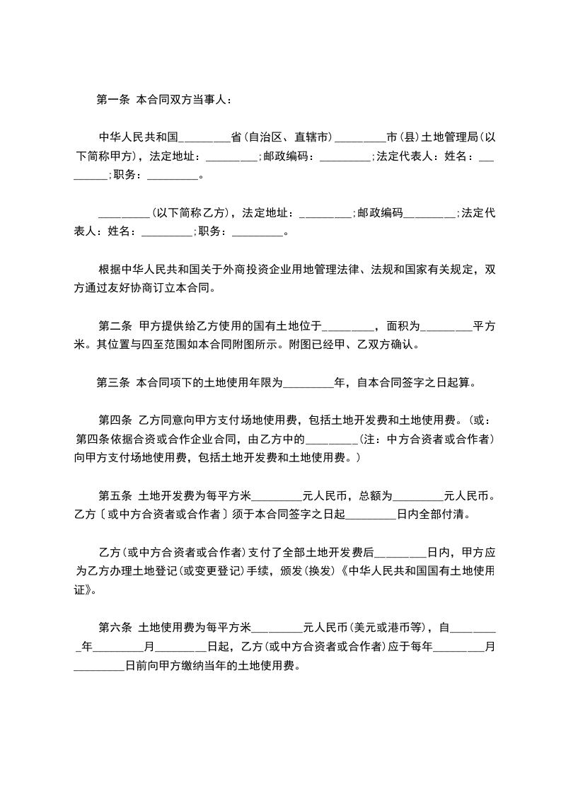 第六条土地使用费为每平方米____元人民币(美元或港币等),自_____年____月___日起,乙方(或中方合资者或合作者)应于每年____月____日前向甲方缴纳当年的土地使用费。