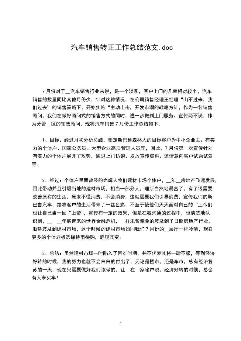 7月份对于__汽车销售行业来说,是一个淡季,客户上门的几率相对较小,汽车销售的数量同比其他月份少,针对这种情况,在公司销售经理王经理“山不过来,我们过去”的销售策略下,开始实施“主动出击,开发市潮的战略方针,作为一名销售顾问,我们在做好顾问式的销售方式的同时,进一步做到上门服务、宣传两不误,作为分管__区的销售顾问,现将汽车销售7月份工作总结如下:
