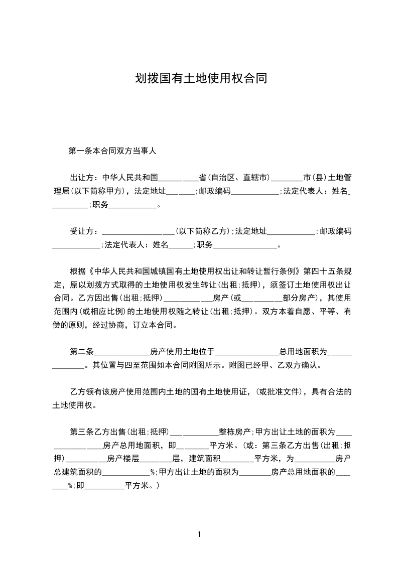 根据《中华人民共和国城镇国有土地使用权出让和转让暂行条例》第四十五条规定,原以划拨方式取得的土地使用权发生转让(出租;抵押),须签订土地使用权出让合同。乙方因出售(出租;抵押)____________房产(或__________部分房产),其使用范围内(或相应比例)的土地使用权随之转让(出租;抵押)。双方本着自愿、平等、有偿的原则,经过协商,订立本合同。