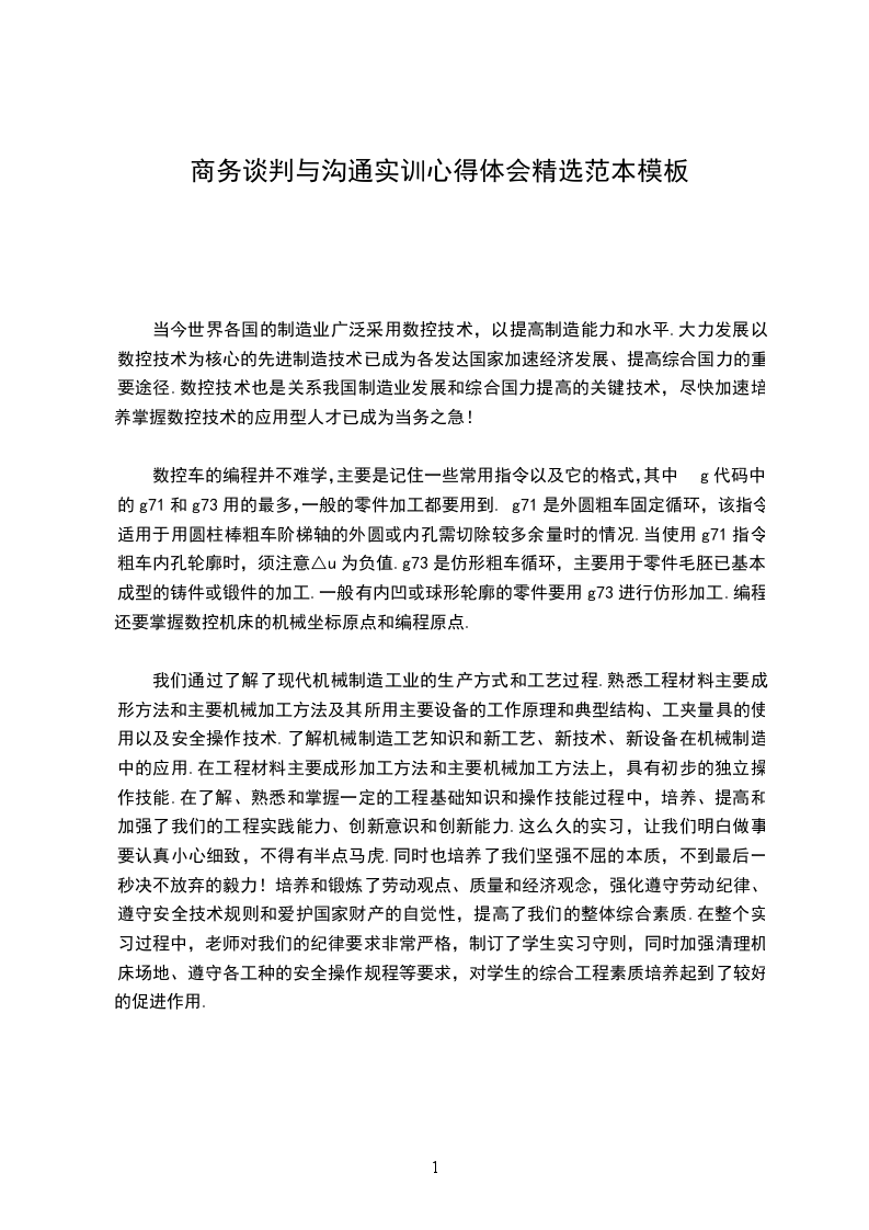 通过数控车床的操作及编程,我深深的感受到了数字化控制的方便、准确、快捷,只要输入正确的程序,车床就会执行相应的操作。比起我们前两天车床的操作要方便的多,可以让机床自动连续完成多个步骤,同时在加工之前还可以进行模拟加工,如果不成功的话,可以修给程序,这样就减少了因为误操作而带来的原料的浪费。并且,只要完成程序的编辑就可以用来重复加工,大大的提高了加工效率。通过老师清晰明了重点突出的讲解,我们很快掌握了数控机床编程软件的应用,对常用的功能能够熟练操作,并且学会基本语法和常用的编程语句,能够进行简单的编程操作。
