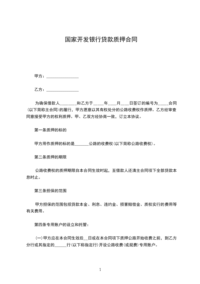 (一)甲方应在本合同生效后__日或在本合同项下质押公路开始收费之前,到乙方分行或其指定的______行(以下称指定行)开设公路收费(或规费)专用账户。