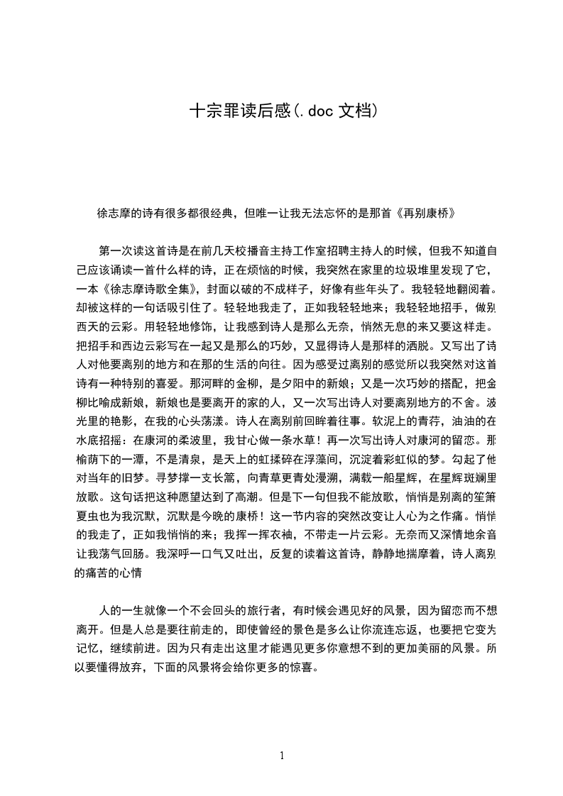 第一次读这首诗是在前几天校播音主持工作室招聘主持人的时候,但我不知道自己应该诵读一首什么样的诗,正在烦恼的时候,我突然在家里的垃圾堆里发现了它,一本《徐志摩诗歌全集》,封面以破的不成样子,好像有些年头了。我轻轻地翻阅着。却被这样的一句话吸引住了。轻轻地我走了,正如我轻轻地来;我轻轻地招手,做别西天的云彩。用轻轻地修饰,让我感到诗人是那么无奈,悄然无息的来又要这样走。把招手和西边云彩写在一起又是那么的巧妙,又显得诗人是那样的洒脱。又写出了诗人对他要离别的地方和在那的生活的向往。因为感受过离别的感觉所以我突然对这首诗有一种特别的喜爱。那河畔的金柳,是夕阳中的新娘;又是一次巧妙的搭配,把金柳比喻成新娘,新娘也是要离开的家的人,又一次写出诗人对要离别地方的不舍。波光里的艳影,在我的心头荡漾。诗人在离别前回眸着往事。软泥上的青荇,油油的在水底招摇:在康河的柔波里,我甘心做一条水草!再一次写出诗人对康河的留恋。那榆荫下的一潭,不是清泉,是天上的虹揉碎在浮藻间,沉淀着彩虹似的梦。勾起了他对当年的旧梦。寻梦撑一支长篙,向青草更青处漫溯,满载一船星辉,在星辉斑斓里放歌。这句话把这种愿望达到了高潮。但是下一句但我不能放歌,悄悄是别离的笙箫;夏虫也为我沉默,沉默是今晚的康桥!这一节内容的突然改变让人心为之作痛。悄悄的我走了,正如我悄悄的来;我挥一挥衣袖,不带走一片云彩。无奈而又深情地余音让我荡气回肠。我深呼一口气又吐出,反复的读着这首诗,静静地揣摩着,诗人离别的痛苦的心情