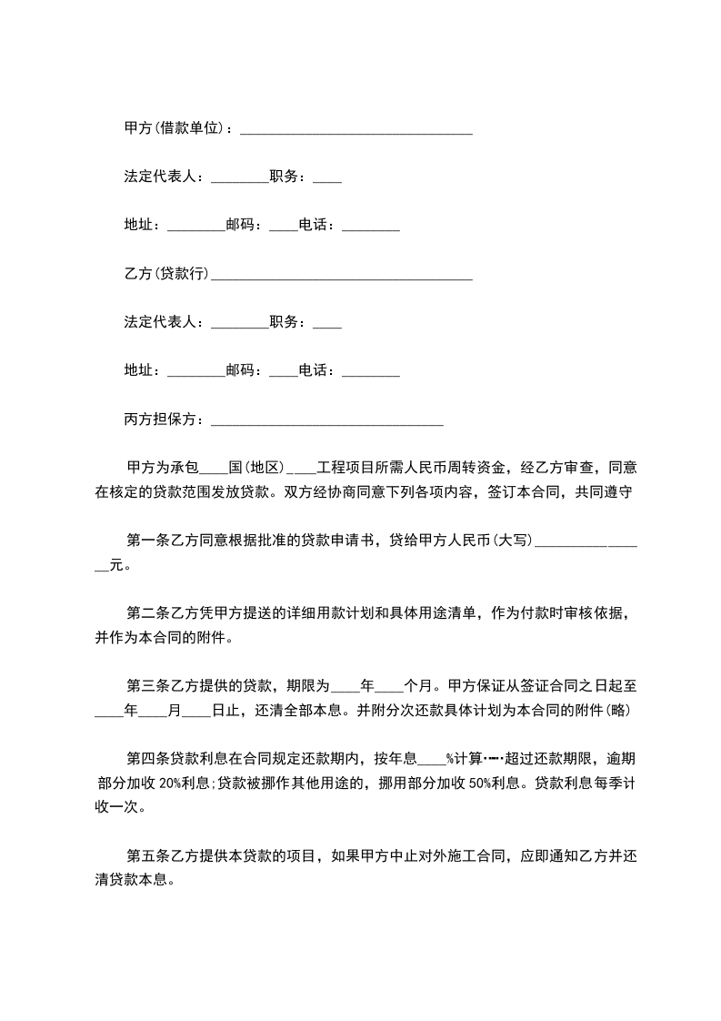 甲方为承包____国(地区)____工程项目所需人民币周转资金,经乙方审查,同意在核定的贷款范围发放贷款。双方经协商同意下列各项内容,签订本合同,共同遵守。
