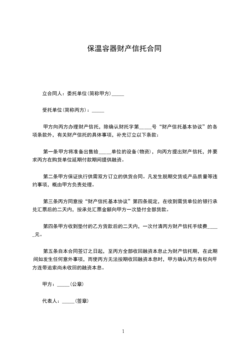 第一条甲方将准备出售给_____单位的设备(物资),向丙方提出财产信托,并要求丙方在购货单位延期付款期间提供融资。