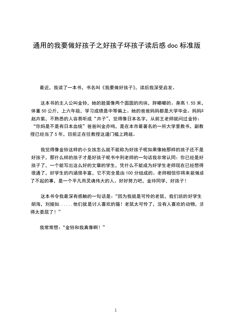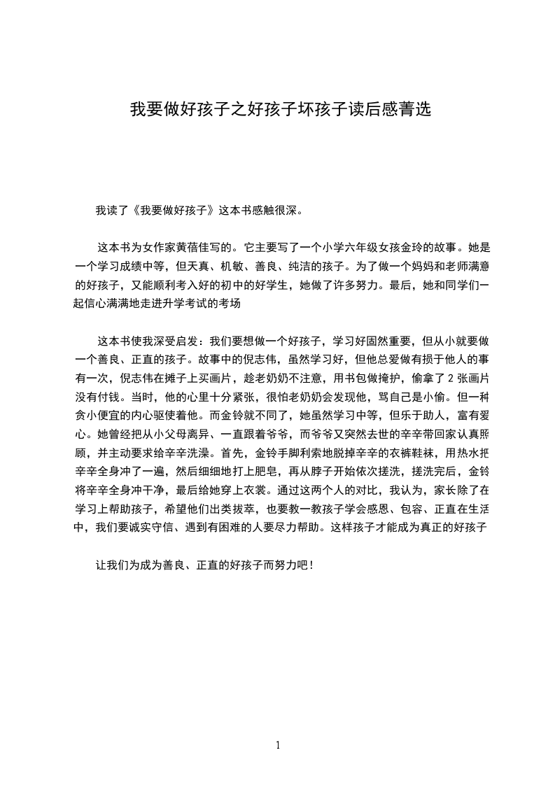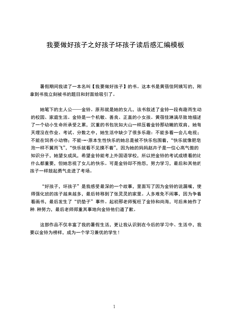 最近,我看了一本好书,它叫《我要做好孩子》。它是由作者黄蓓佳写的。这本书的主人公叫“金铃”。她身高1、55,体重50公斤,是一个活泼可爱的重量级六年级学生。她的脸蛋肥肥的,从小到大被人揪过上千回,用她的话说,都快被揪出老茧来了。虽然她成绩永远考不到100分,但她经过不断的努力,终于自信地走进了考场,成了一个好孩子。