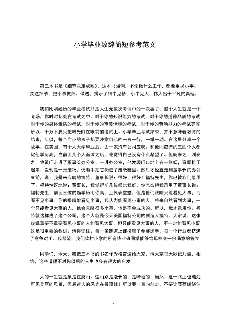 我们刚刚经历的毕业考试只是人生无数次考试中的一次罢了,整个人生就是一个考场,你时时都处在考试之中。对于你的知识能力的考试,对于你的道德品质的考试,对于你的身体素质的考试,对于你的审美情趣的考试,对于你的劳动能力的考试等等。所以,千万不要只把眼光盯在眼前的考试上。小学毕业考试结束,并不意味着教育的结束,所以,每个广小的孩子都要注意自己的一言一行,一举一动。在这里分享一个故事。在美国,有个人大学毕业后,去一家汽车公司应聘。和他同应聘的三四个人都比他学历高,当前面几个人面试之后,他觉得自己没有什么希望了。但既来之,则安之。他敲门走进了董事长办公室,一进办公室,他发现门口地上有一张纸,弯腰捡了起来,发现是一张废纸,便顺手把它扔进了废纸篓里。然后才径直走到董事长的办公桌前,说:我是来应聘的福特。董事长说:很好,很好!福特先生,你已被我们录用了。福特惊讶地说:董事长,我觉得前几位都比我好,你怎么把我录用了董事长说:福特先生,前面三位的确学历比你高,且仪表堂堂,但是他们眼睛只能看见大事,而看不见小事。你的眼睛能看见小事,我认为能看见小事的人,将来自然看到大事,一个只能看见大事的人,他会忽略很多小事。他是不会成功的。所以,我才录用你。福特就这样进了这个公司,这个人就是今天美国福特公司的创造人福特。大家说,这张废纸重要不重要看见小事的人能看见大事,但只能看见大事的人,不一定能看见小事,这是很重要的教训。请你记住:每一条跑道上都挤满了参赛选手,每一个行业都挤满了竞争对手。我希望,我们钦村小学的所有毕业班同学能够给母校交一份满意的答卷!