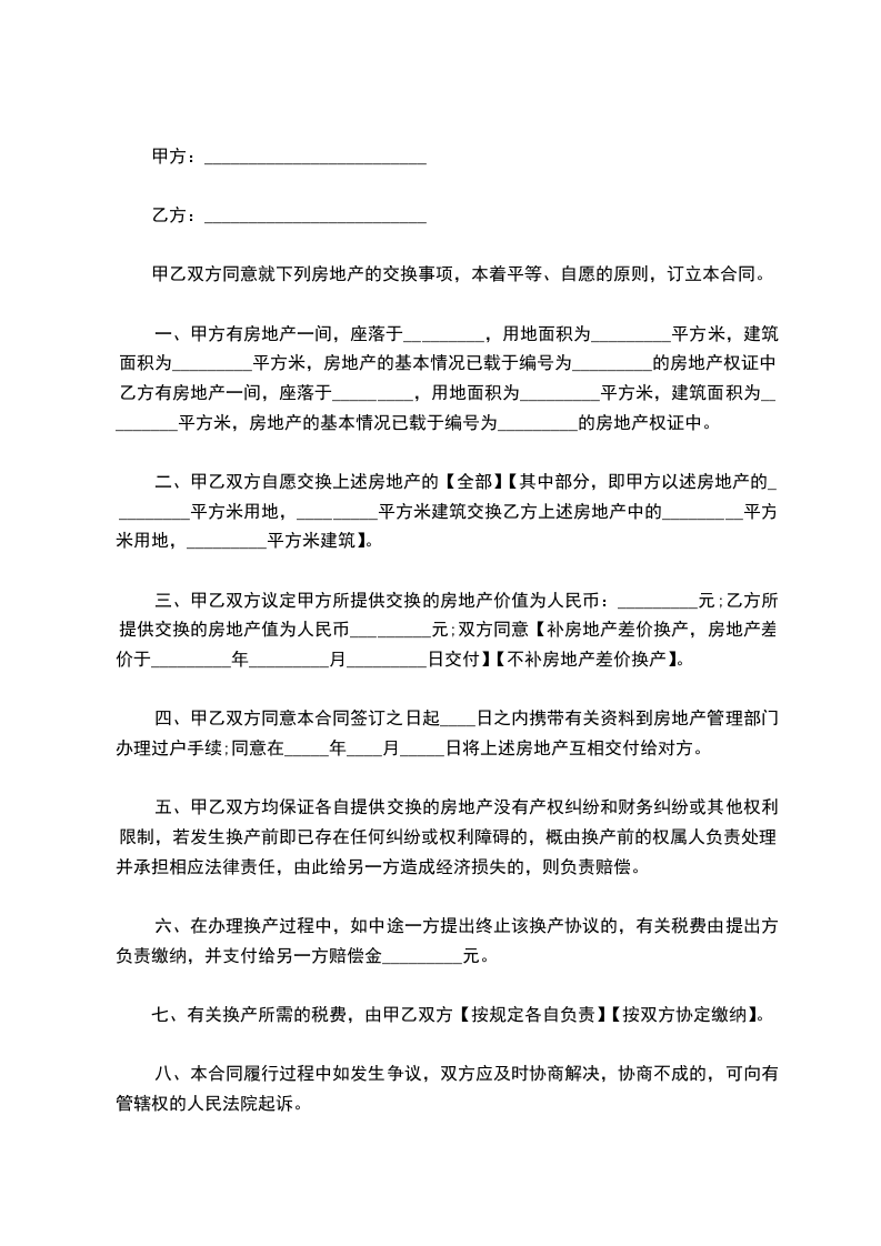 二、甲乙双方自愿交换上述房地产的【全部】【其中部分,即甲方以述房地产的_________平方米用地,_________平方米建筑交换乙方上述房地产中的_________平方米用地,_________平方米建筑】。