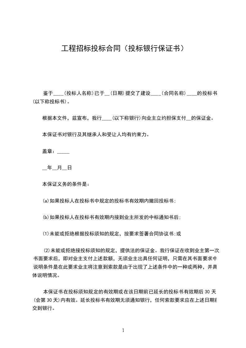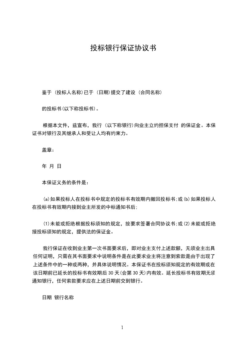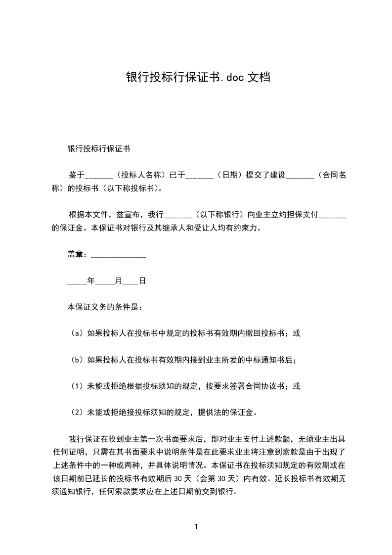 根据本文件,兹宣布,我行_______(以下称银行)向业主立约担保支付_______的保证金。本保证书对银行及其继承人和受让人均有约束力。