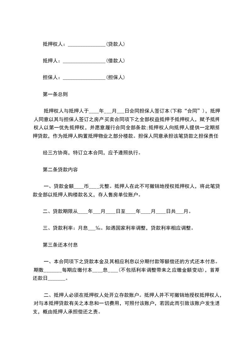 抵押权人与抵押人于____年___月___日会同担保人签订本(下称“合同”),抵押人同意以其与担保人签订之房产买卖合同项下之全部权益抵押予抵押权人,赋予抵押权人以第一优先抵押权,并愿意履行合同全部条款;抵押权人向抵押人提供一定期抵押贷款,作为抵押人购置抵押物业之部分楼款。担保人同意承担该笔贷款之担保责任。