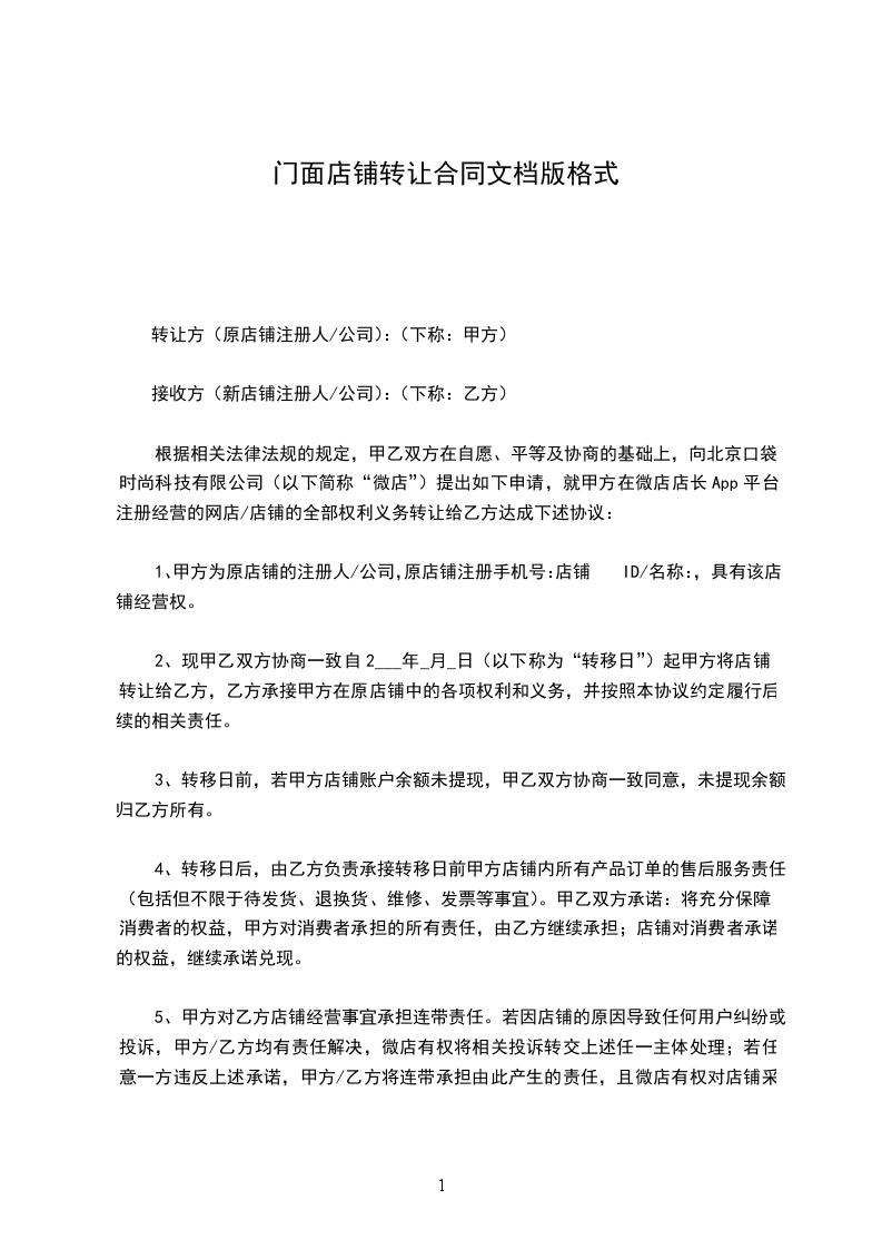 根据相关法律法规的规定,甲乙双方在自愿、平等及协商的基础上,向北京口袋时尚科技有限公司(以下简称“微店”)提出如下申请,就甲方在微店店长App平台注册经营的网店/店铺的全部权利义务转让给乙方达成下述协议: