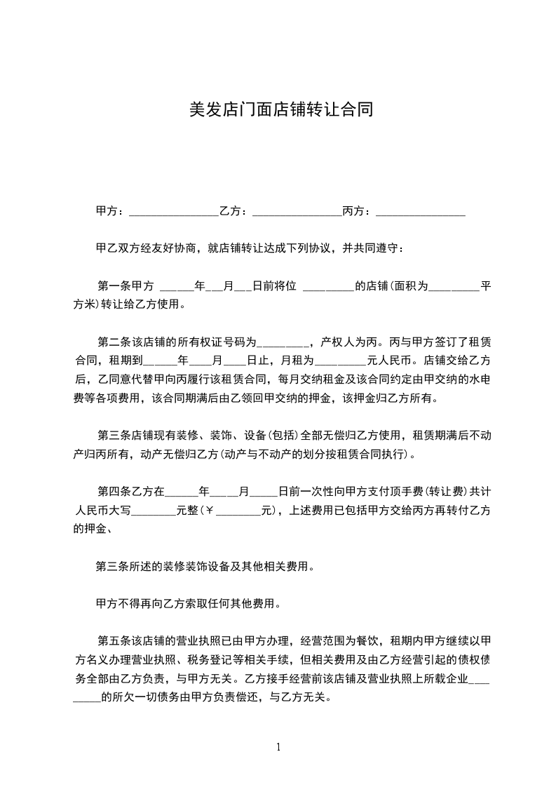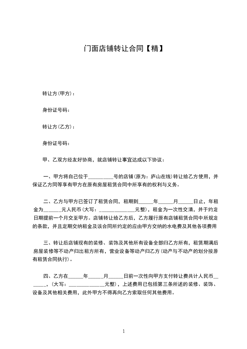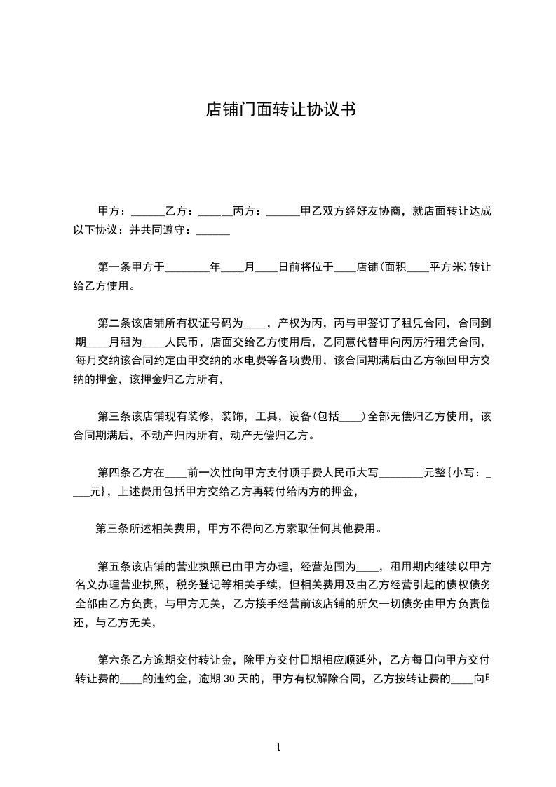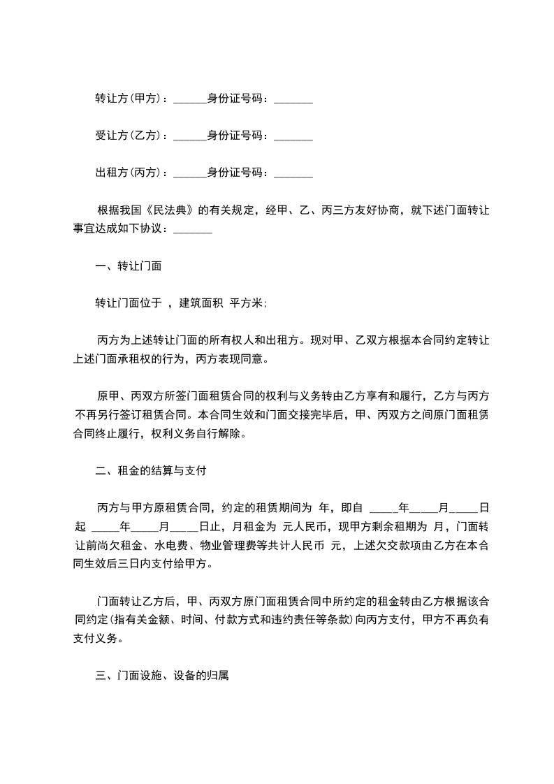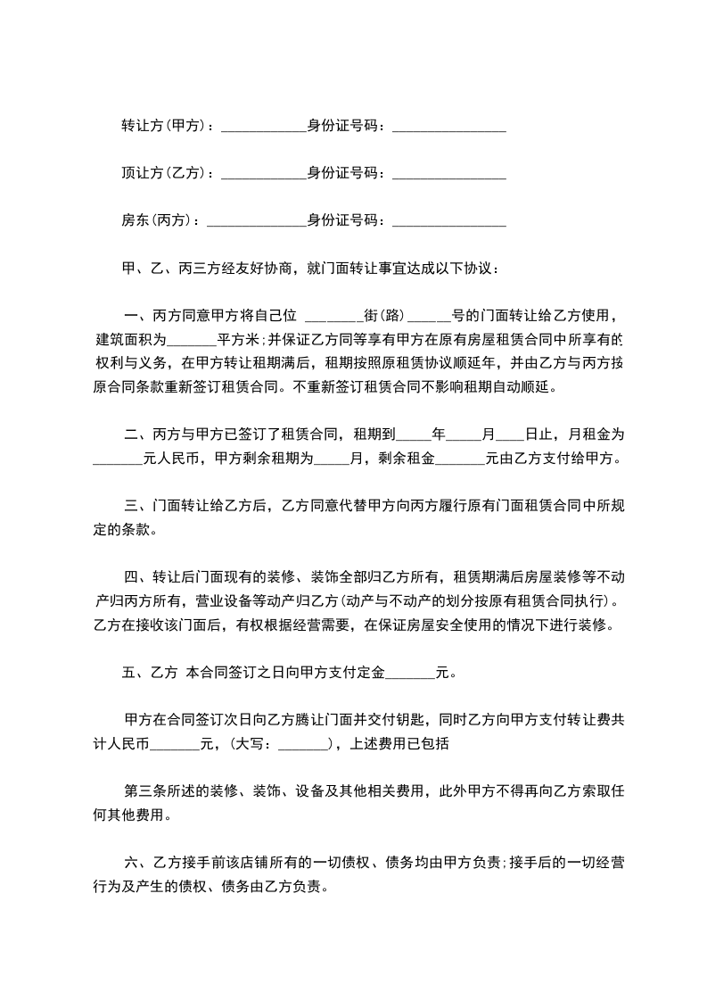 一、房东同意甲方将自己位于______________街(路)______________号的门面转让给乙方使用,建筑面积为______________平方米;并保证乙方同等享有甲方在原有房屋租赁合同中所享有的权利与义务,在甲方转让租期满后,租期按照原租赁协议顺延年,并由乙方与房东按原合同条款重新签订租赁合同。不重新签订租赁合同不影响租期自动顺延。