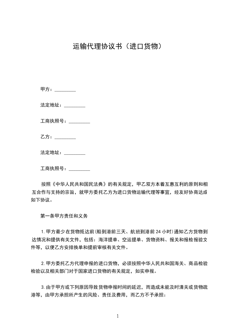 按照《中华人民共和国民法典》的有关规定,甲乙双方本着互惠互利的原则和相互合作与支持的宗旨,就甲方委托乙方为进口货物运输代理等事宜,经友好协商达成如下协议。