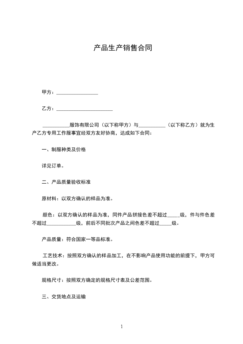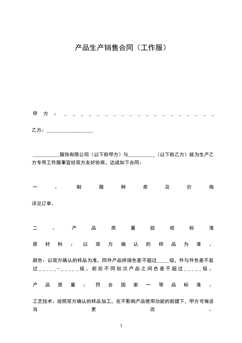 ___________服饰有限公司(以下称甲方)与___________(以下称乙方)就为生产乙方专用工作服事宜经双方友好协商,达成如下合同: