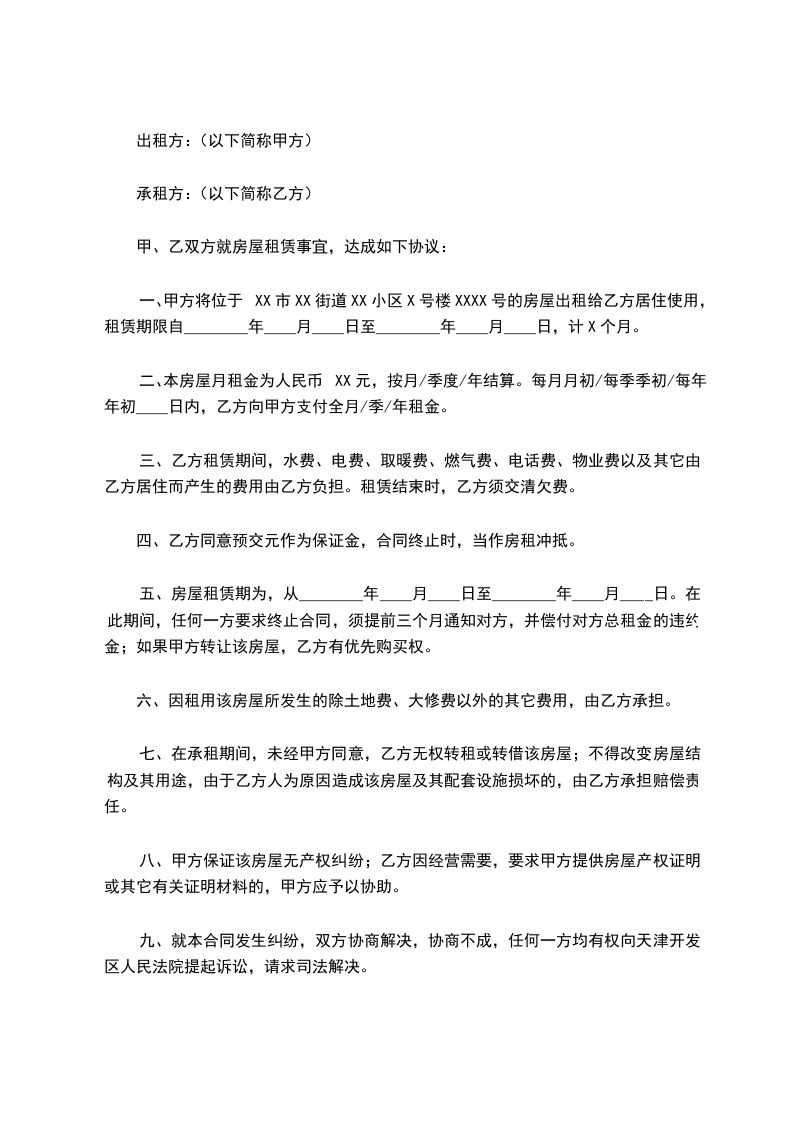 一、甲方将位于XX市XX街道XX小区X号楼XXXX号的房屋出租给乙方居住使用,租赁期限自________年____月____日至________年____月____日,计X个月。