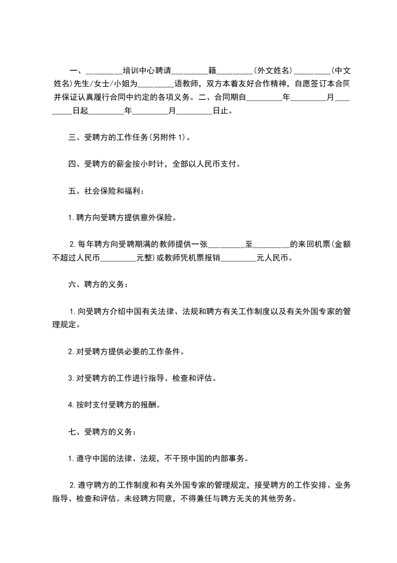 一、_________培训中心聘请_________籍_________(外文姓名)_________(中文姓名)先生/女士/小姐为_________语教师,双方本着友好合作精神,自愿签订本合同并保证认真履行合同中约定的各项义务。二、合同期自_________年_________月_________日起_________年_________月_________日止。