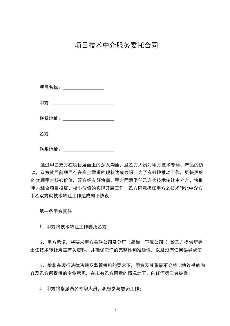 通过甲乙双方在项目层面上的深入沟通,及乙方人员对甲方技术专利、产品的访谈,双方就目前项目存在资金需求的现状达成共识。为了有效地推动工作,更快更好的实现甲方核心价值,双方经友好协商,甲方同意委任乙方为技术转让中介方,协助甲方结合项目投资、核心价值的实现开展工作;乙方同意担任甲方之技术转让中介方,甲乙双方就技术转让工作达成如下协议: