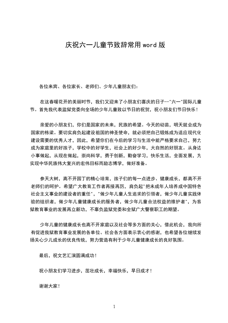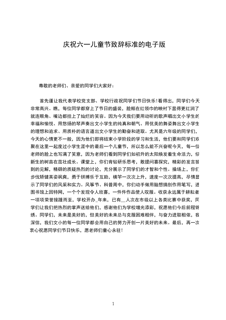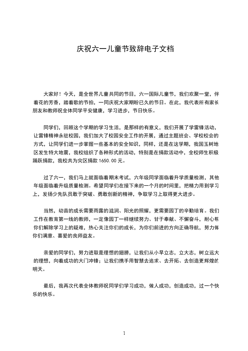 大家好!今天是六一国际儿童节,是少年儿童节自己的节日,在这阳光灿烂、姹紫嫣红的日子里,我代表育英的全体师生员工对百忙中来参加我校”六一”庆典活动的领导、来宾、家长们表示热烈的欢迎,并对大家长期以来对我校的关心和支持致以诚挚的谢意!在这喜庆的时刻,我们向祖国的花朵、可爱的小朋友们致以节日的祝贺,祝愿全世界的小朋友们都健康快乐,茁壮成长。