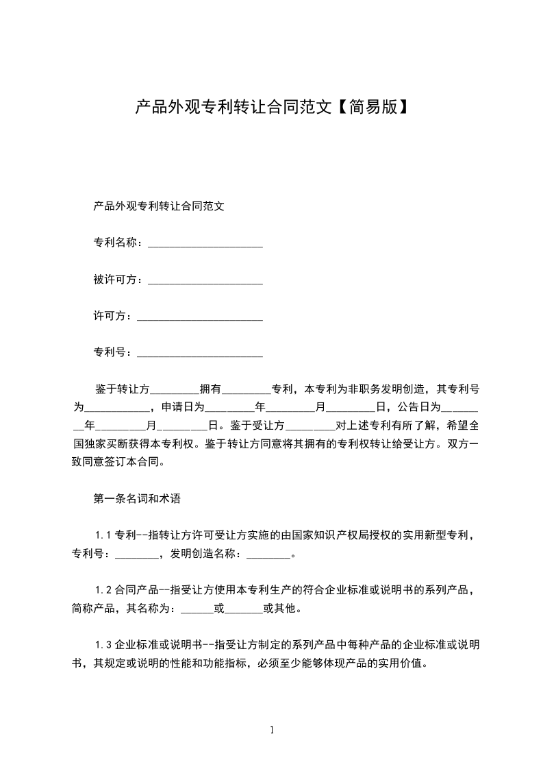1.2合同产品--指受让方使用本专利生产的符合企业标准或说明书的系列产品,简称产品,其名称为:______或_______或其他。