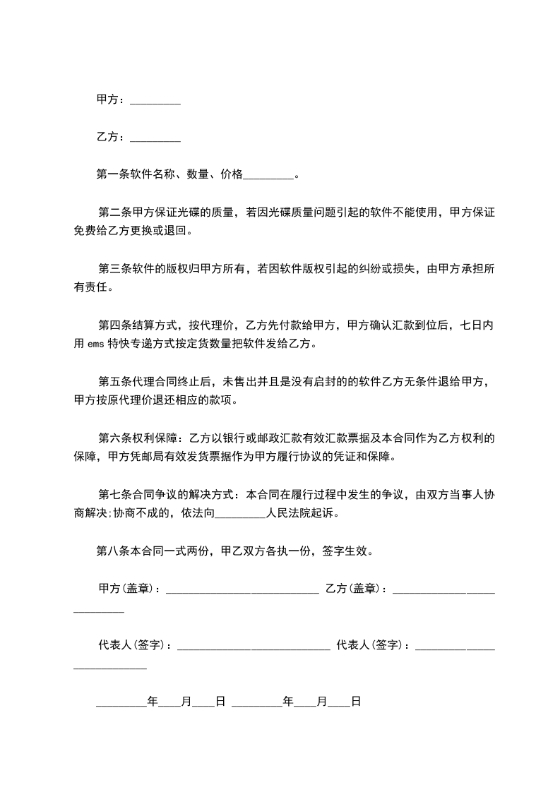 第五条代理合同终止后,未售出并且是没有启封的的软件乙方无条件退给甲方,甲方按原代理价退还相应的款项。