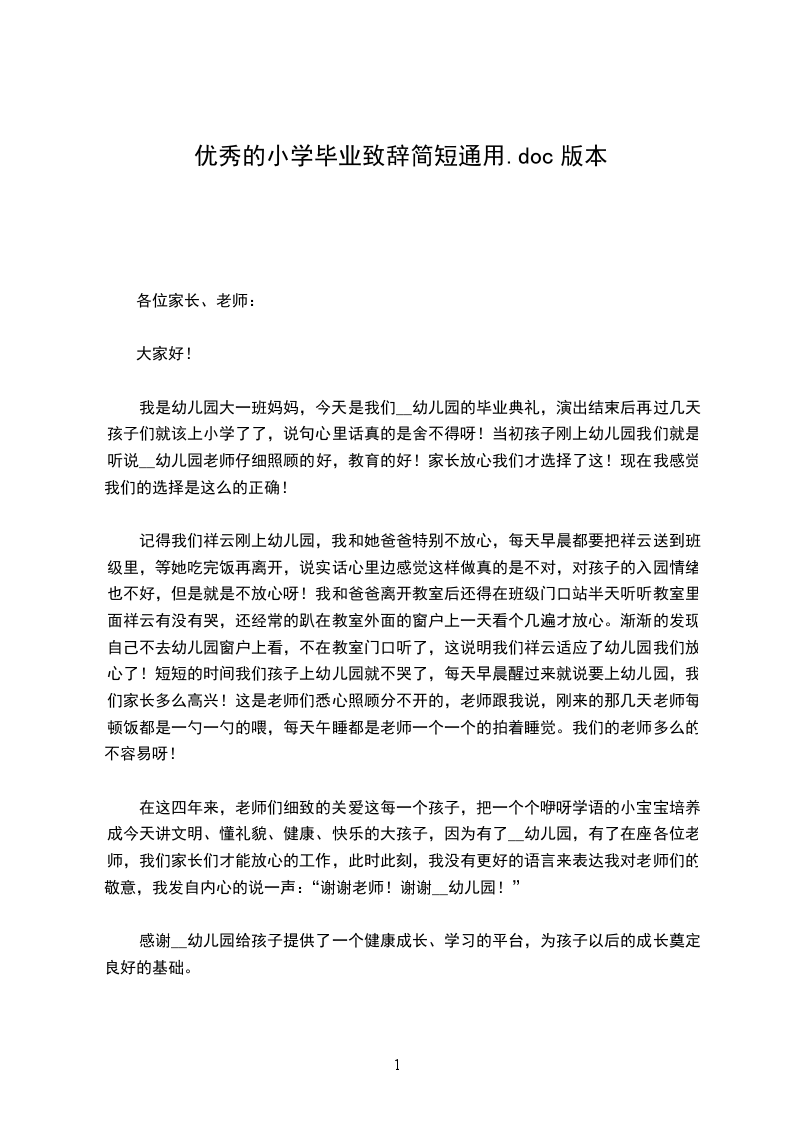 我是幼儿园大一班妈妈,今天是我们__幼儿园的毕业典礼,演出结束后再过几天孩子们就该上小学了了,说句心里话真的是舍不得呀!当初孩子刚上幼儿园我们就是听说__幼儿园老师仔细照顾的好,教育的好!家长放心我们才选择了这!现在我感觉我们的选择是这么的正确!