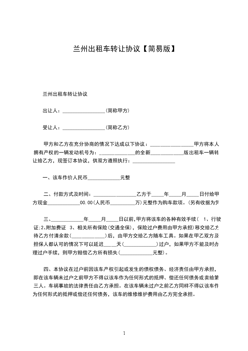 甲方和乙方在充分协商的情况下达成以下协议:_________________甲方将本人拥有产权的一辆发动机号为:______________的全新_____________版出租车一辆转让给乙方,现签订本协议,供双方遵照执行:_________________