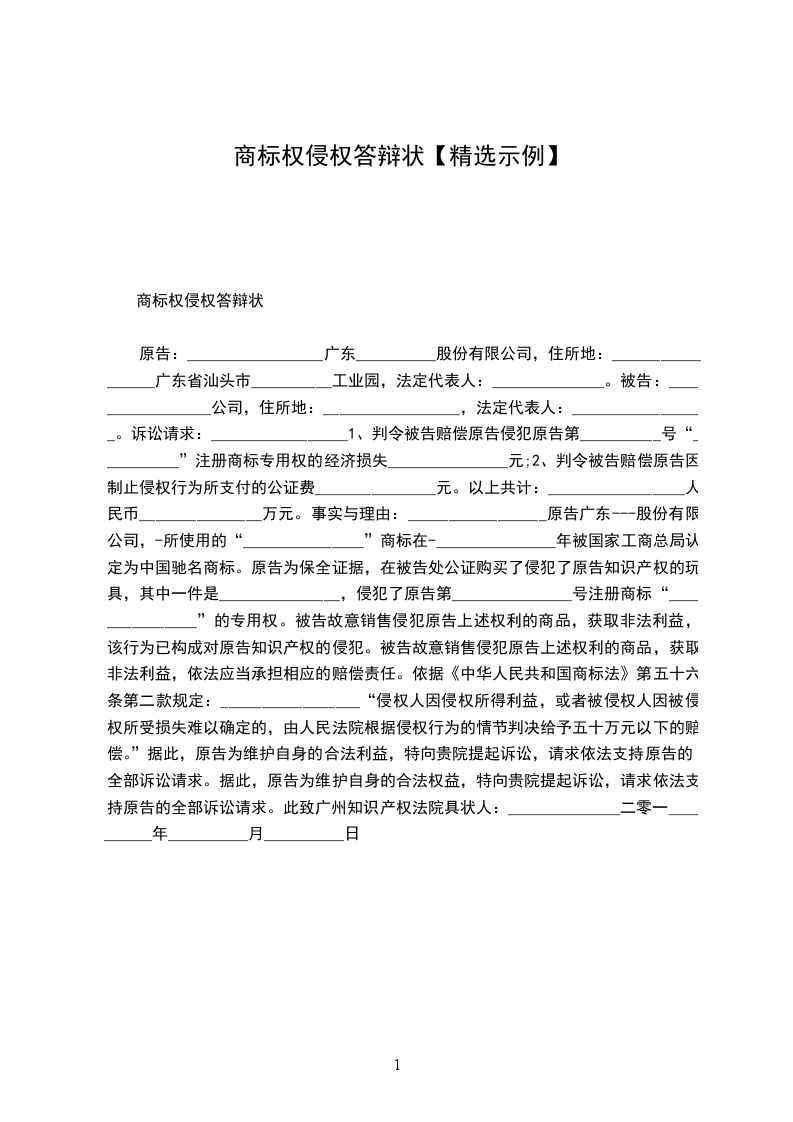 商标权侵权答辩状