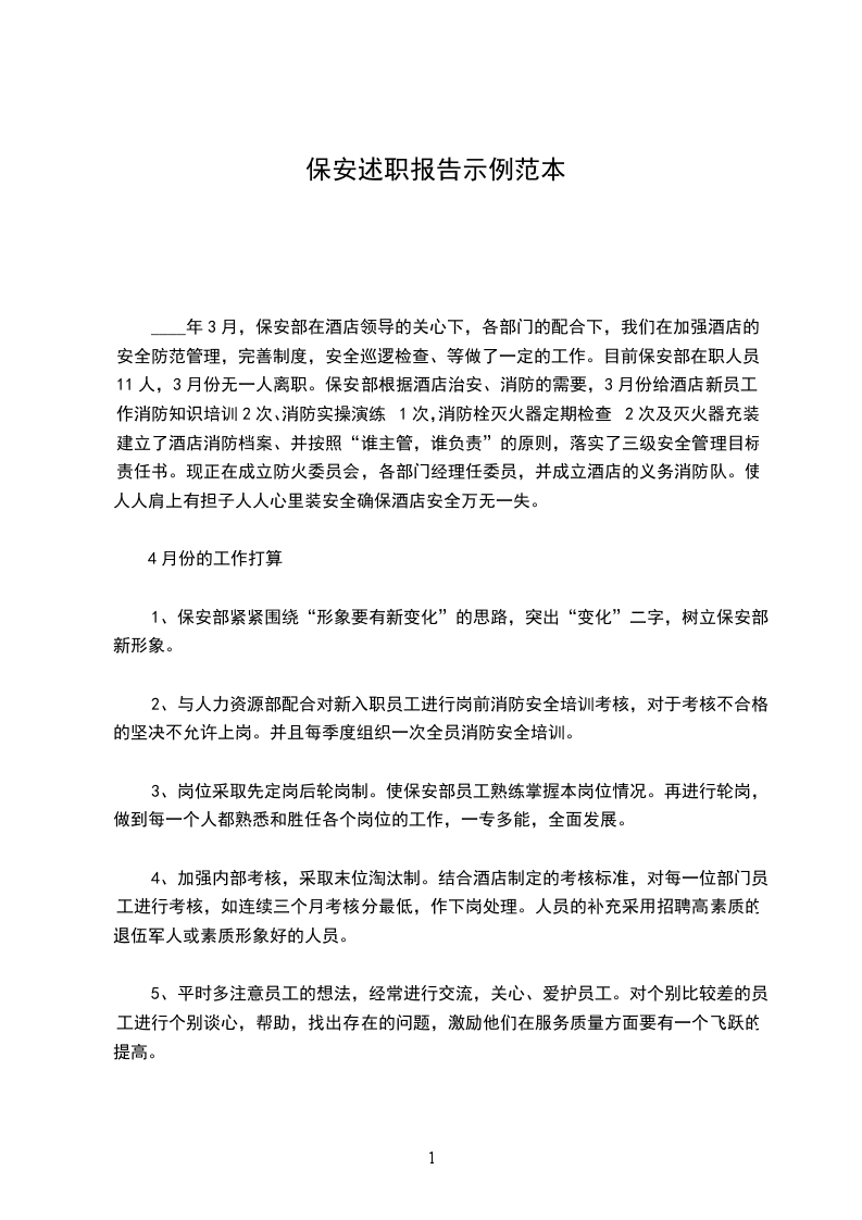 ____年3月,保安部在酒店领导的关心下,各部门的配合下,我们在加强酒店的安全防范管理,完善制度,安全巡逻检查、等做了一定的工作。目前保安部在职人员11人,3月份无一人离职。保安部根据酒店治安、消防的需要,3月份给酒店新员工作消防知识培训2次、消防实操演练1次,消防栓灭火器定期检查2次及灭火器充装。建立了酒店消防档案、并按照“谁主管,谁负责”的原则,落实了三级安全管理目标责任书。现正在成立防火委员会,各部门经理任委员,并成立酒店的义务消防队。使人人肩上有担子人人心里装安全确保酒店安全万无一失。