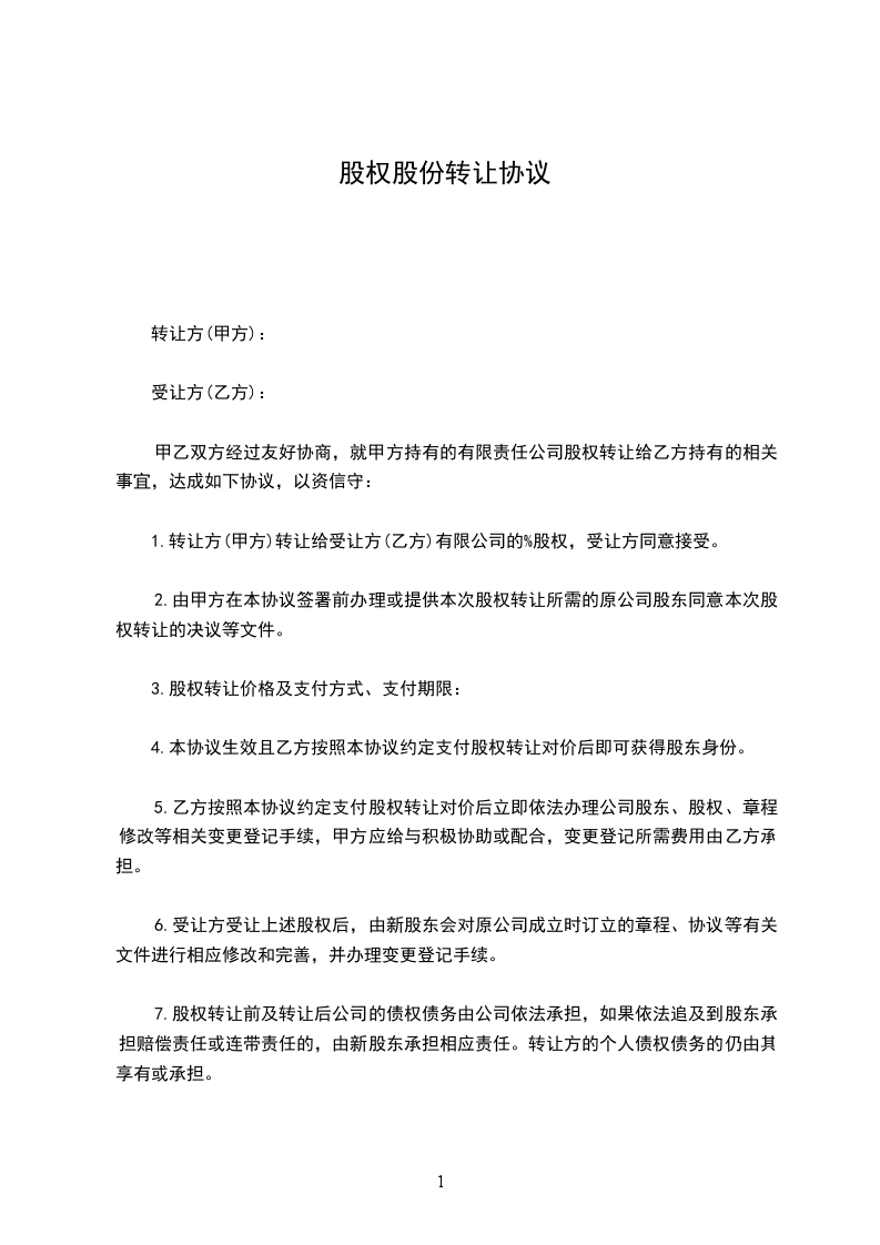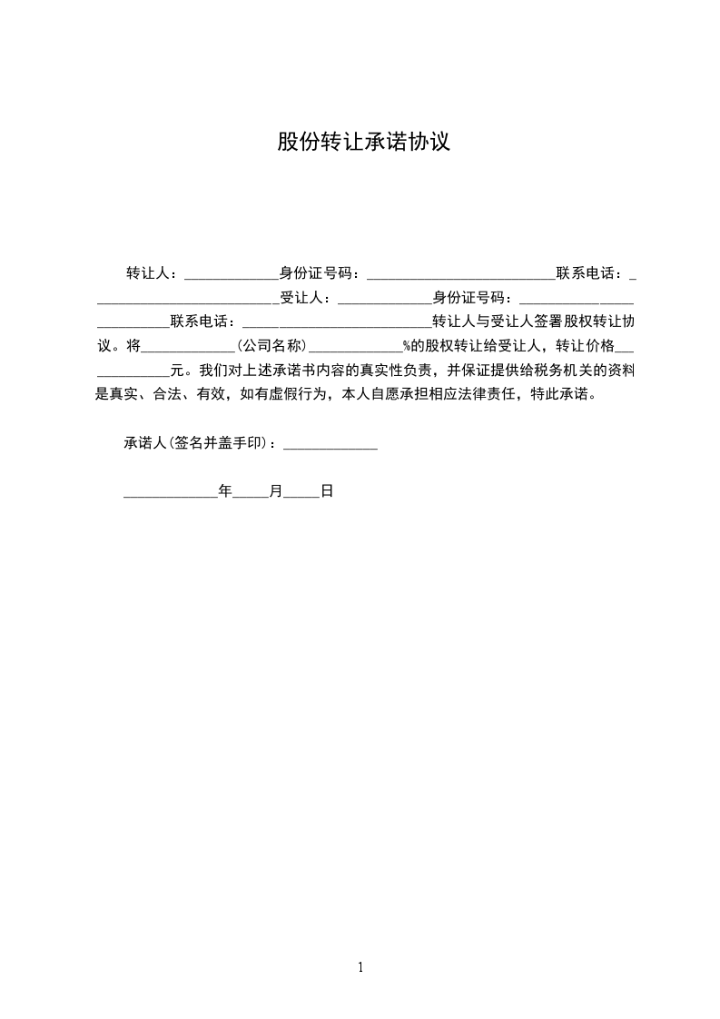 转让人:_____________身份证号码:__________________________联系电话:__________________________受让人:_____________身份证号码:__________________________联系电话:__________________________转让人与受让人签署股权转让协议。将_____________(公司名称)_____________%的股权转让给受让人,转让价格_____________元。我们对上述承诺书内容的真实性负责,并保证提供给税务机关的资料是真实、合法、有效,如有虚假行为,本人自愿承担相应法律责任,特此承诺。