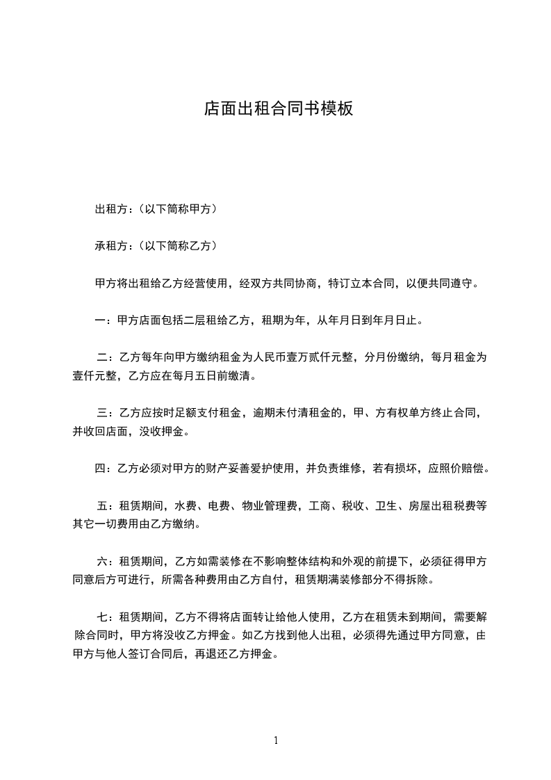 一:甲方店面包括二层租给乙方,租期为年,从______年____月____日到______年____月____日止。