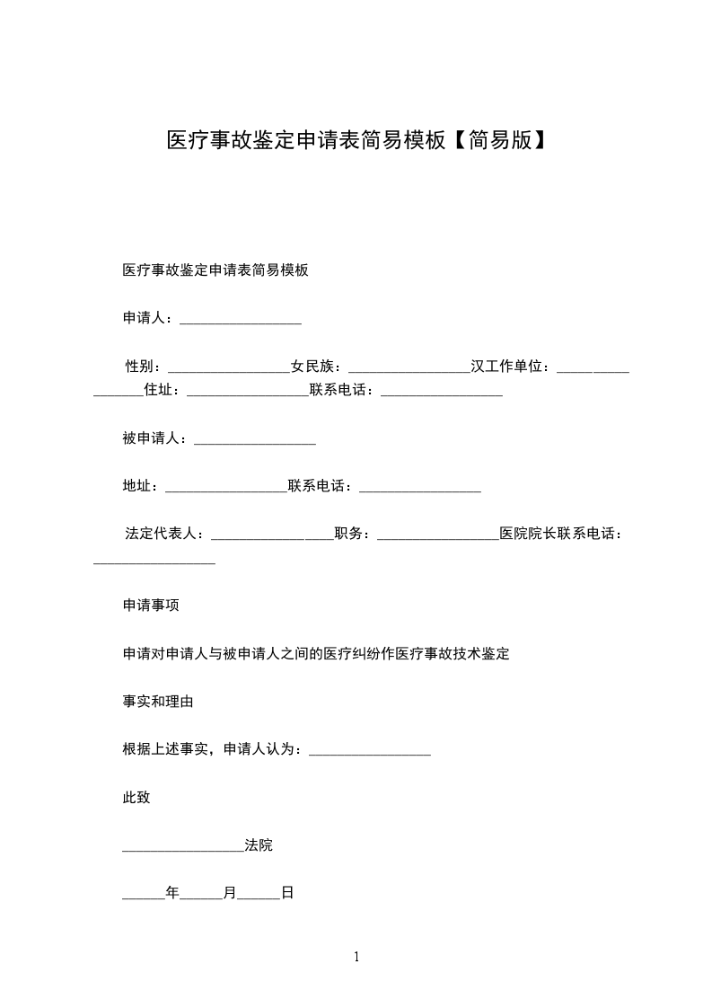 医疗事故鉴定申请表简易模板