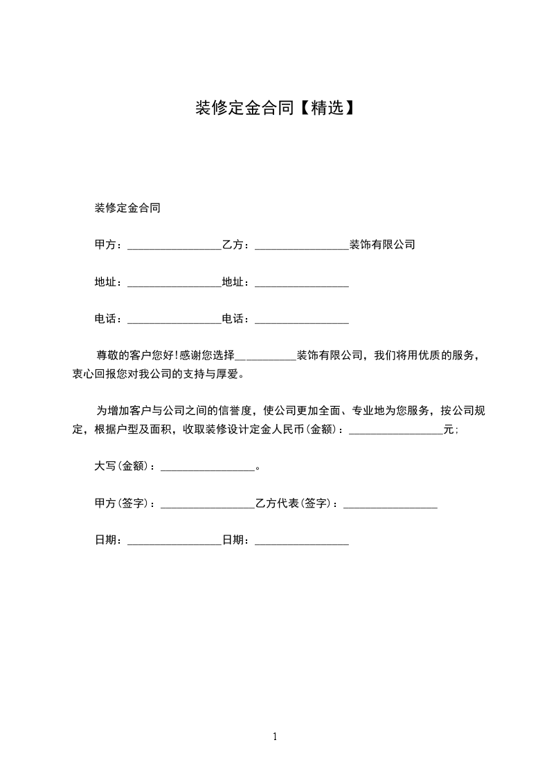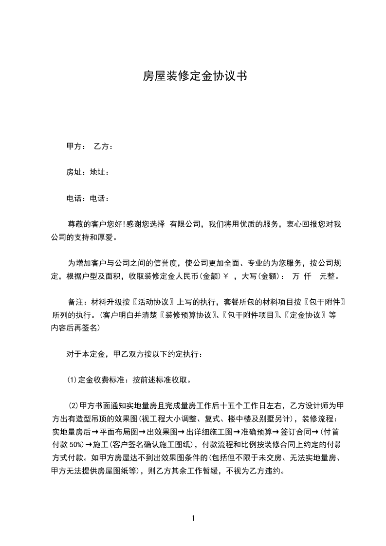 甲方:_________________乙方:_________________装饰有限公司地址:_________________地址:_________________电话:_________________电话:_________________尊敬的客户您好!感谢您选择___________装饰有限公司,我们将用优质的服务,衷心回报您对我公司的支持与厚爱。为增加客户与公司之间的信誉度,使公司更加全面、专业地为您服务,按公司规定,根据户型及面积,收取装修设计定金人民币(金额):_________________元;大写(金额):_________________。甲方(签字):_________________乙方代表(签字):_________________日期:_________________日期:_________________