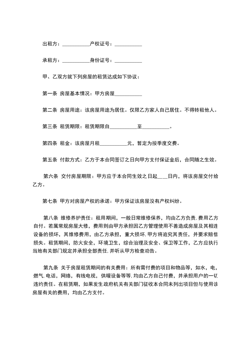一、甲方将位于__________市__________街道______小区______号楼号的房屋出租给乙方居住使用,租赁期限自_______________年______月______日至__________年______月______日,计______个月。