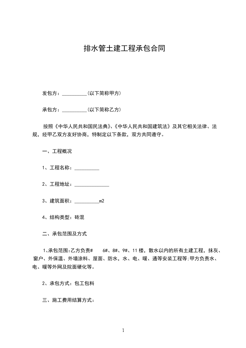 发包单位(甲方):_________________承包人:(乙方):_________________根据中华人民共和国民法典和建设安装工程承包合同条例的原则,结合本工程具体情况,双方达成如下协议:第1条:工程概况1.1、工程名称:_________________工程地点:__________________________________工程内容:含如下内容:地下室基础承台及基础梁的开挖、桩头的破除、开挖后基坑的抽水(抽水工具由甲方提供)、基坑基槽采用人工整平、砖胎模完工后的回填整平、多余的土方由乙方用大挖机甩到地下室主道的两侧后由甲方负责外运。工程总价:按下室占地面积_______元(此价格含不可考虑的因素,没有任何价格调差)。工期:第2条:合同使用标准和法律2.1、合同使用标准:______________2.2、适用法律:中华人民共和国民法典和建设安装工程承包合同条例第3条:甲方工作3.1公布工地各项管理制度,对工程质量、安全、进度、文明施工、材料耗用等进行检查、督促,监督施工质量并协调解决施工过程中的各种问题。3.2按照合同条款按时按量支付工程款。3.3如乙方不服从甲方指挥,不能按时完成甲方规定的施工任务,或发生重大失误导致工程停工,甲方有权终止合同。对造成甲方经济损失的,由乙方负责赔偿。3.4负责加强安全管理、完善安全规章制度,做好安全设防。3.5对乙方违反各种管理制度、操作规程、安全生产、文明施工规定的人员甲方有权清理出施工现场。乙方不服从甲方现场施工员的安排,不能按时、按量、按要求完成施工任务(或整改内容)的,甲方有权另行安排人员完成,造成的一切费用均由乙方负责,对消极对待、屡教不改的,甲方有权终止协议;中途退场的,甲方有权不付任何工资费用。第4条:乙方工作4.1乙方须安排一个负责人长期呆在现场协调工作,至该工作内容全部完成为止,4.2乙方严格按照甲方测量出的桩顶标高进行破除,标高测量中乙方必须派人员配合,严禁用炮机凿除,人工破除过程中不能伤及桩钢筋,破除后的桩头必须保持平整完好。预留钢筋必须按甲方的要求所预留。破除完的桩头由乙方用挖机吊出基坑,并掩埋在车库底板以下。4.3前期进场必须保证有一台大挖机和两台小挖机方可开始施工,施工中乙方必须按照甲方的进度相应的增加机械人员,如进度达不到要求,甲方有权终止合同,并按完成的50%结算。4.4乙方进场后,甲方负责提供住宿及生活水电,乙方自带破桩工具(包括空压机)。在施工过程中,甲、乙双方必须紧密配合,确保施工进度以保证工程的如期完成。乙方人员在施工中必须注意安全,上班必须安全帽,穿胶鞋,如发生安全事故,由乙方完全负责,严格遵守公司的各项安全,生产制度和各种生活制度。另乙方必须保证施工进度,如进度严重跟不上,甲方有权中止乙方的合作。第5条:工程款工程款支付金额和时间:按地下室后浇带分成六块,每块垫层砼完成后按完成工程量的70%支付一次工程款,其余款项待地下室垫层全部浇筑完一周内全部付清,甲方违约的责任:甲方不按期付款,乙方有权停工,甲方应承担乙方停工期间的一切损失。乙方所收的工程款不含任何税金,乙方只提供收款收据。第6条:合同的生效与终止合同签字之日起生效,工程完成、工程款全部付清后合同自行终止。第7条:合同份数:甲乙双方各执2份。第8条:合同款未尽事宜,经双方协商后,用补充协议补充或协商解决。甲方(公章):_________乙方(公章):_________法定代表人(签字):_________法定代表人(签字):__________________年____月____日_________年____月____日