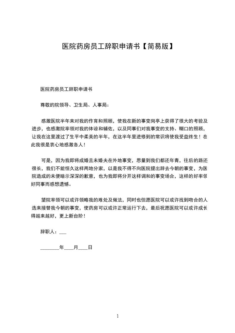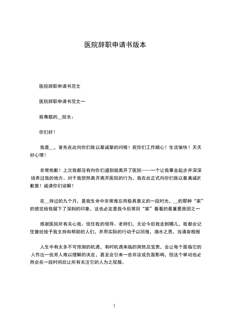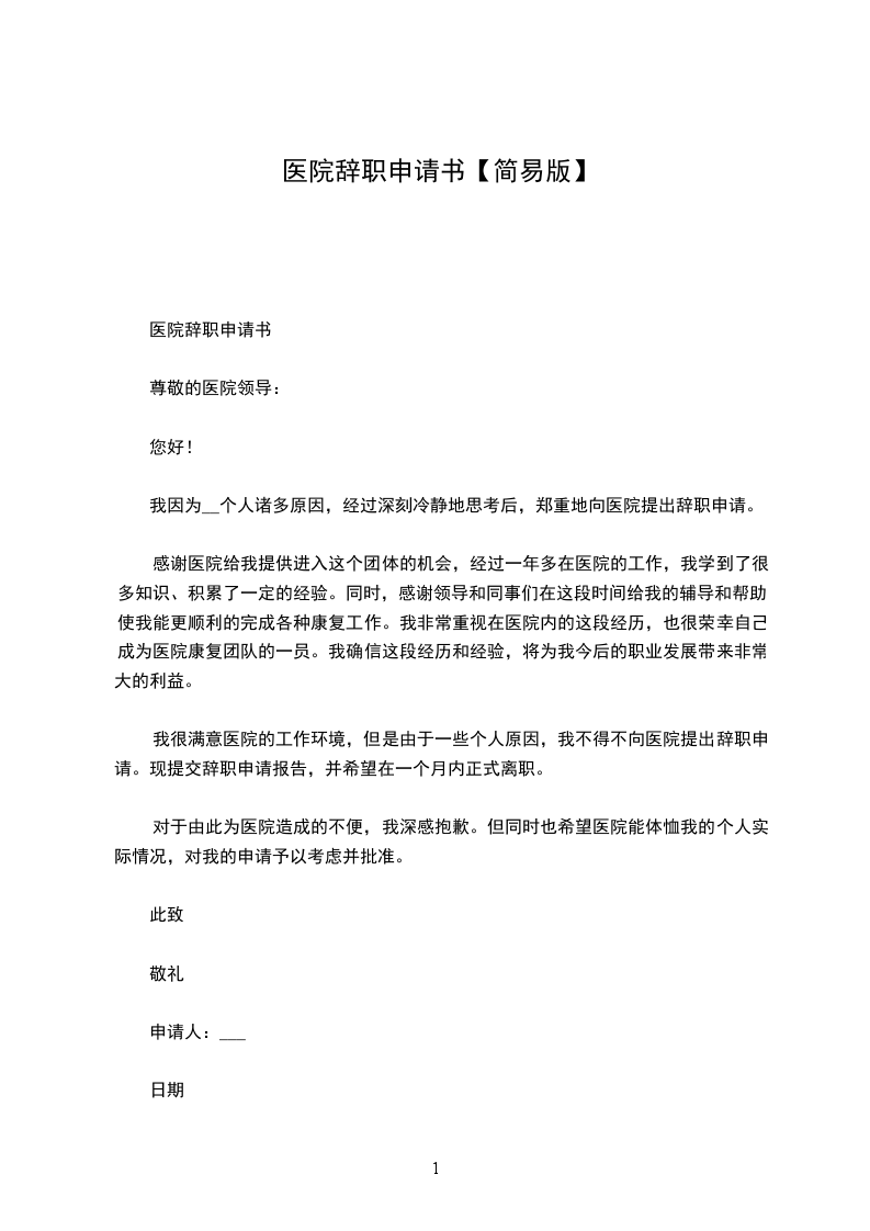 医院辞职申请书