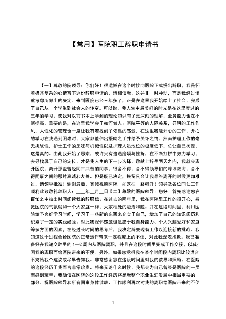 我很满意医院的工作环境,但是由于一些个人原因,我不得不向医院提出辞职申请。现提交辞职申请报告,并希望在一个月内正式离职。