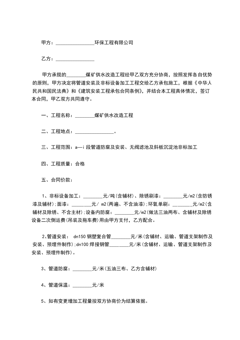 甲方:________________环保工程有限公司乙方:________________甲方承揽的________煤矿供水改造工程经甲乙双方充分协商,按照发挥各自优势的原则,甲方决定将管道安装及非标设备加工工程交给乙方承包施工,根据《中华人民共和国民法典》和《建筑安装工程承包合同条例》,并结合本工程具体情况,签订本合同,甲乙双方共同遵守。