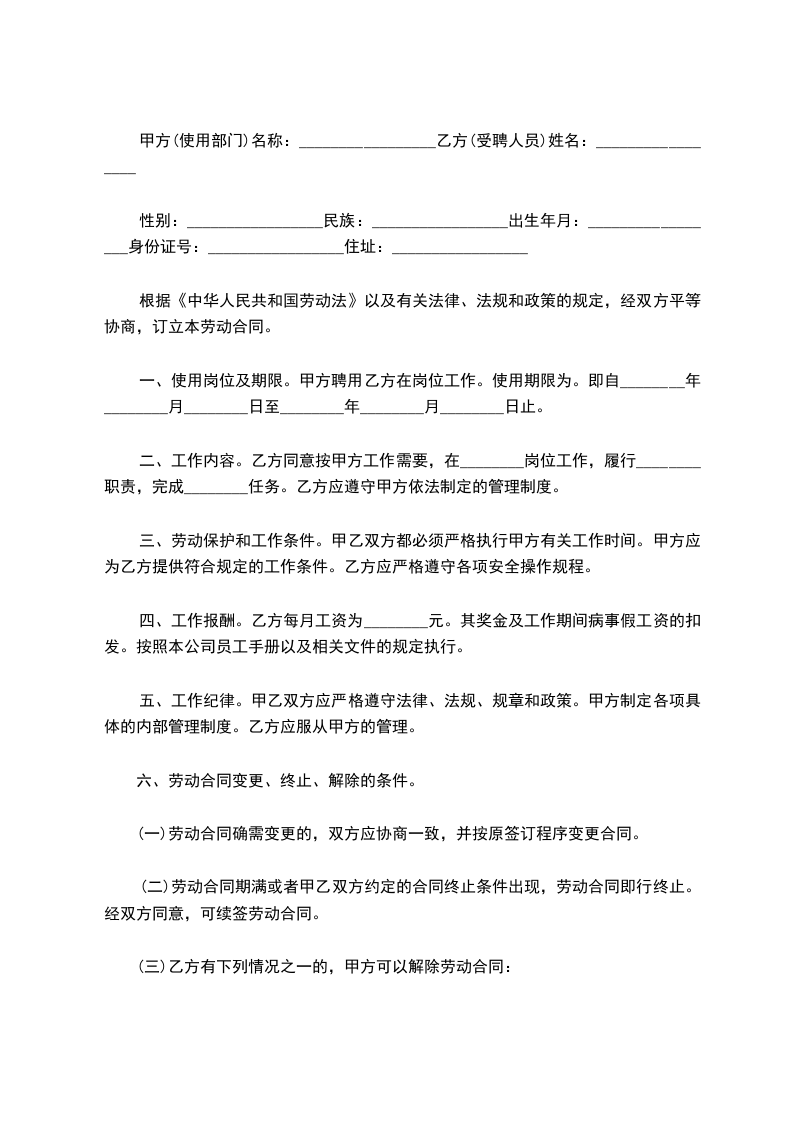 二、工作内容。乙方同意按甲方工作需要,在________岗位工作,履行________职责,完成________任务。乙方应遵守甲方依法制定的管理制度。