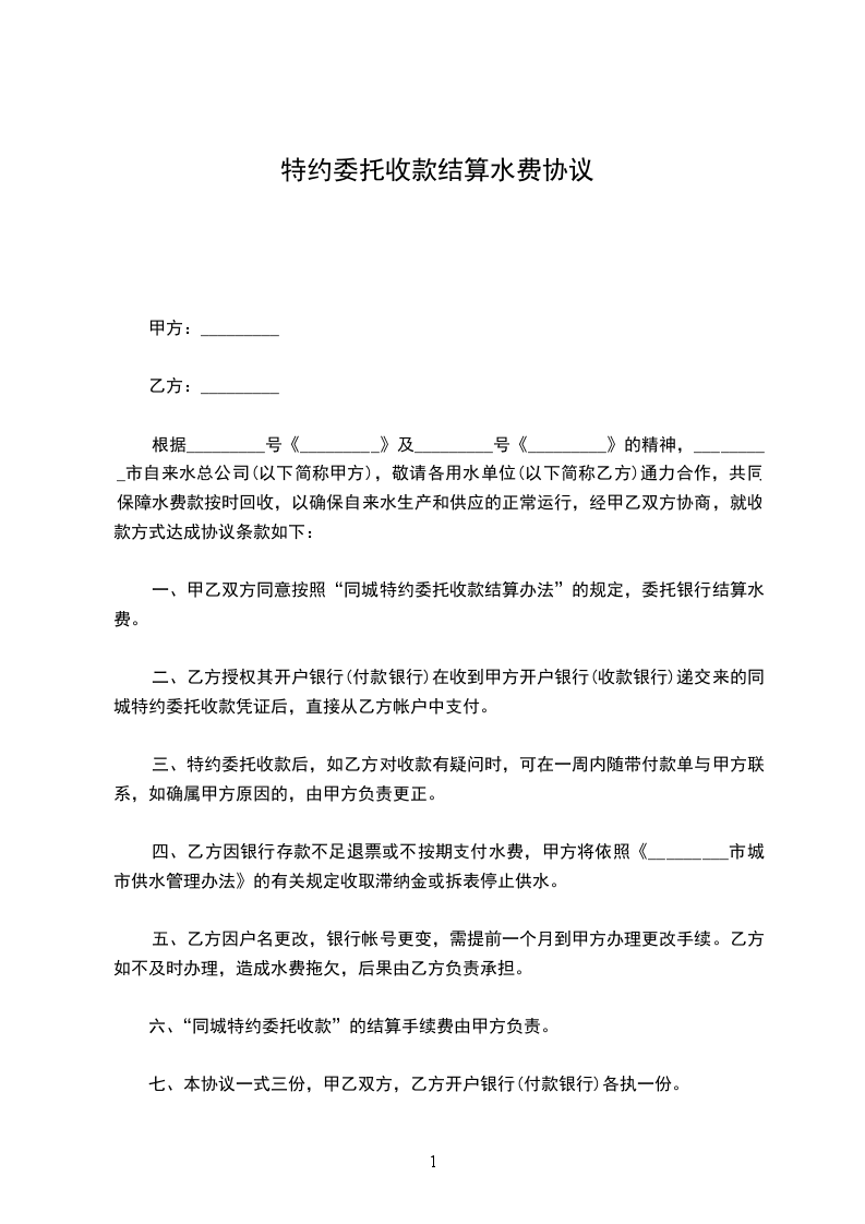 根据_________号《_________》及_________号《_________》的精神,_________市自来水总公司(以下简称甲方),敬请各用水单位(以下简称乙方)通力合作,共同保障水费款按时回收,以确保自来水生产和供应的正常运行,经甲乙双方协商,就收款方式达成协议条款如下: