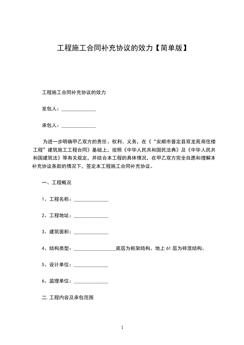为进一步明确甲乙双方的责任、权利、义务,在《“安顺市普定县双龙苑商住楼工程”建筑施工工程合同》基础上,按照《中华人民共和国民法典》及《中华人民共和国建筑法》等有关规定,并结合本工程的具体情况,在甲乙双方完全自愿和理解本补充协议条款的情况下,签定本工程施工合同补充协议。