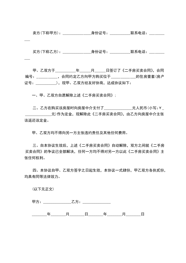 二、乙方在购买该房屋时向房屋中介支付了_______________元人民币(小写:¥_______________元)作为定金,现解除此《二手房买卖合同》,由乙方向房屋中介主张该返还该定金。甲、乙双方均不得向另一方主张违约责任及其他任何费用。
