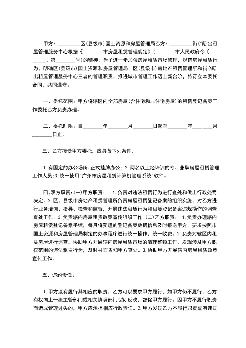 甲方:_________区(县级市)国土资源和房屋管理局乙方:_________街(镇)出租屋管理服务中心根据《________市房屋租赁管理规定》(________市人民政府令〔________〕第________号)的精神,为了进一步加强房屋租赁市场管理,规范房屋租赁行为,明确区(县级市)国土资源和房屋管理局、区(县级市)房地产租赁管理所和街(镇)出租屋管理服务中心三者的管理职责,推进城市管理工作迈上新台阶,特订立本委托合同,共同遵守。