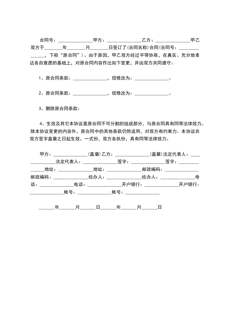 合同号:_______________甲方:_______________乙方:_______________甲乙双方于________年________月________日签订了(合同名称)合同(合同号:_______________,下称“原合同”)。由于原因,甲乙双方经过平等协商,在真实、充分地表达各自意愿的基础上,对原合同内容作出如下变更,并由双方共同遵守: