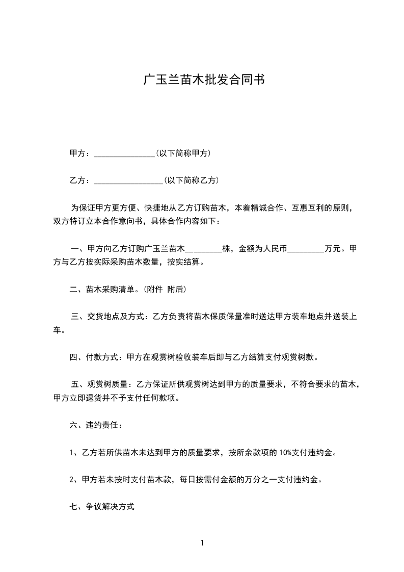 一、甲方向乙方订购广玉兰苗木_________株,金额为人民币_________万元。甲方与乙方按实际采购苗木数量,按实结算。