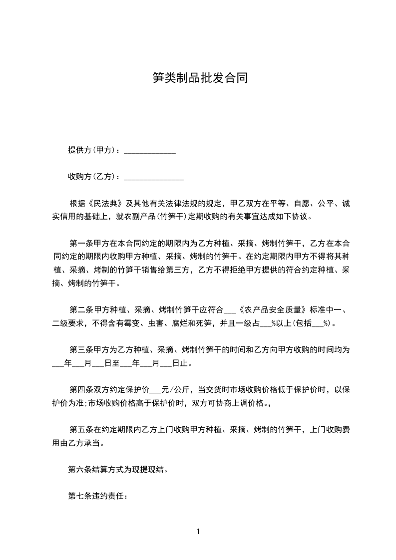 第一条甲方在本合同约定的期限内为乙方种植、采摘、烤制竹笋干,乙方在本合同约定的期限内收购甲方种植、采摘、烤制的竹笋干。在约定期限内甲方不得将其种植、采摘、烤制的竹笋干销售给第三方,乙方不得拒绝甲方提供的符合约定种植、采摘、烤制的竹笋干。